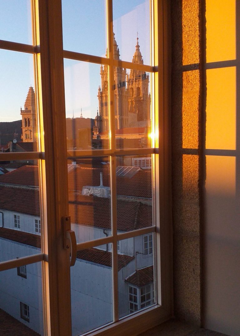 Disponemos de 42 habitaciones individuales con/sin baño interior con diferentes precios, muy confortables, luz natural y vistas inigualables a la Catedral de Santiago.